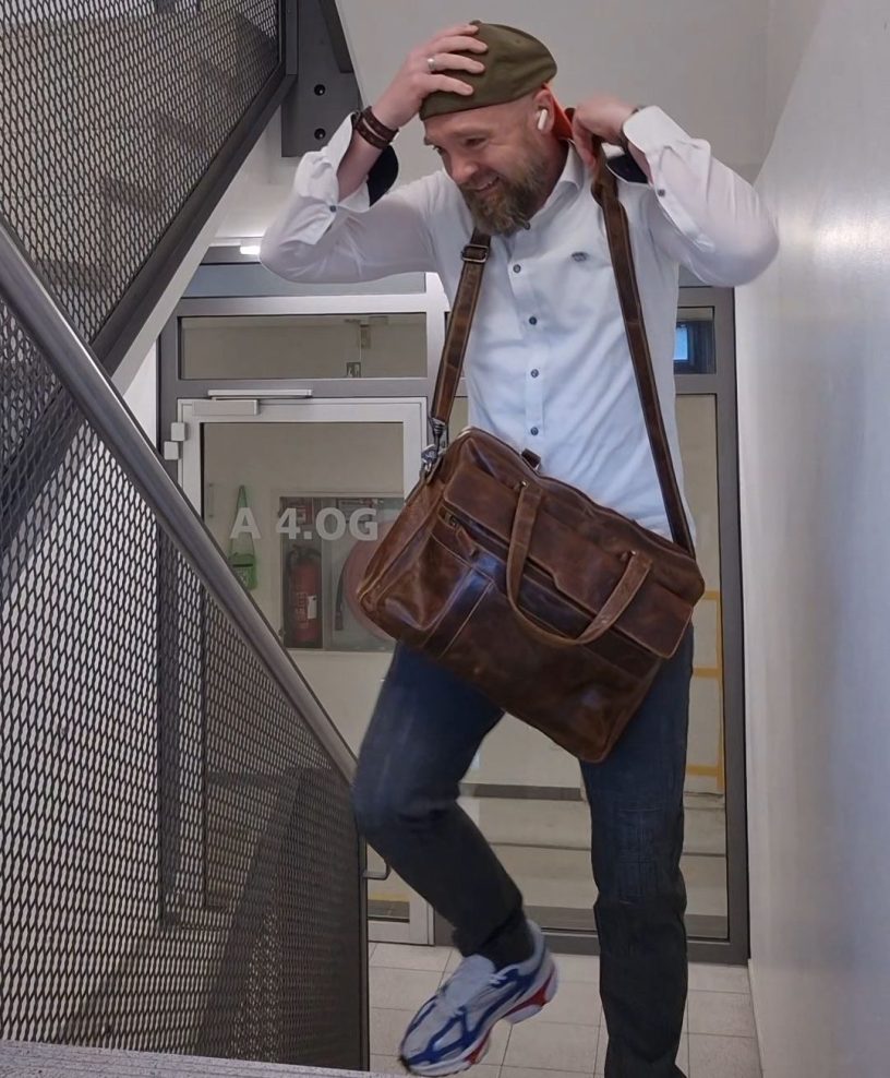 Ich hingegen transportiere derzeit alles mit meiner Aktentasche, nachdem das Komitee aus Ich und Über-Ich (Sigmund Freud) beschlossen hatte, dass das Transportieren von Dingen mittels Rucksack eine altertümliche und längst überholte Angelegenheit ist, und mir daher hernach nahegelegt hat, mir stehenden Fußes eine Aktentasche zu kaufen. Ich zögerte nicht, las Hegl mit Zöpfen und erwarb bei einem sympathischen Unternehmen eine nachhaltige Aktentasche aus Leder, die direkt am nächsten Tag – weniger nachhaltig – geliefert wurde. Nachdem ich zusammen mit dem befreundeten Paketboten (Sie kennen ihn vielleicht schon aus dieser Geschichte.) die gröbsten Stationen der Ledertaschenlieferkette durchgegangen war und dann für angemessen befunden hatte, testete ich gleich am nächsten Arbeitstag meine neue Aktentasche.