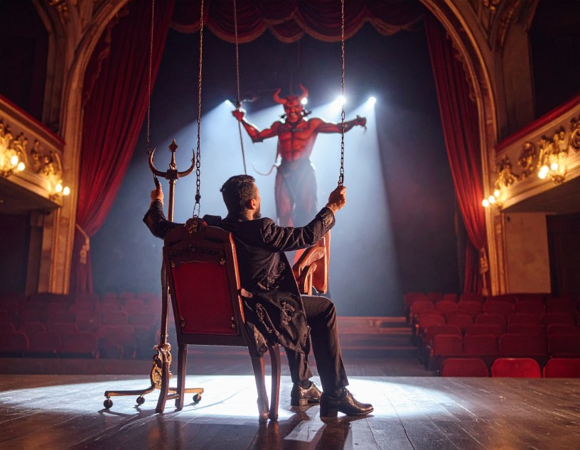 Der Teufel, am Ende besiegt, ist hinab in die Hölle gefahren. Es ist nun am Mann unter den Brettern, ihn wieder zurück auf Erden zu schicken. Er wägt ab. Er sieht die Verlockung, er schmeckt das süße Gift – und doch zögert er. Ist sein einziger Hebel, den er Abend für Abend zieht, wirklich so belanglos?