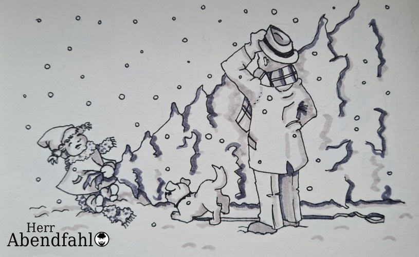 Das Beitragsbild stammt aus der Feder meiner Frau, die schon immer die Bilder zu Herrn Abendfahls Geschichten gezeichnet hat.