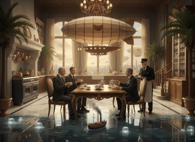 „Ich habe selten etwas so Brillantem beiwohnen dürfen!“, ruft er und klatscht. Frau Sandfuß hat derweil das Telefon beendet und informiert die Herrschaften: „Wir wurden vom Amt für Schifffahrtsangelegenheiten gebeten – nein, es war mehr eine dringende Empfehlung -, uns ins obere Drittel des Salons zurückzuziehen. Das Wasser käme.“